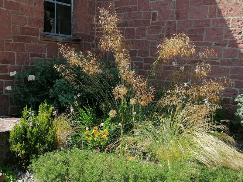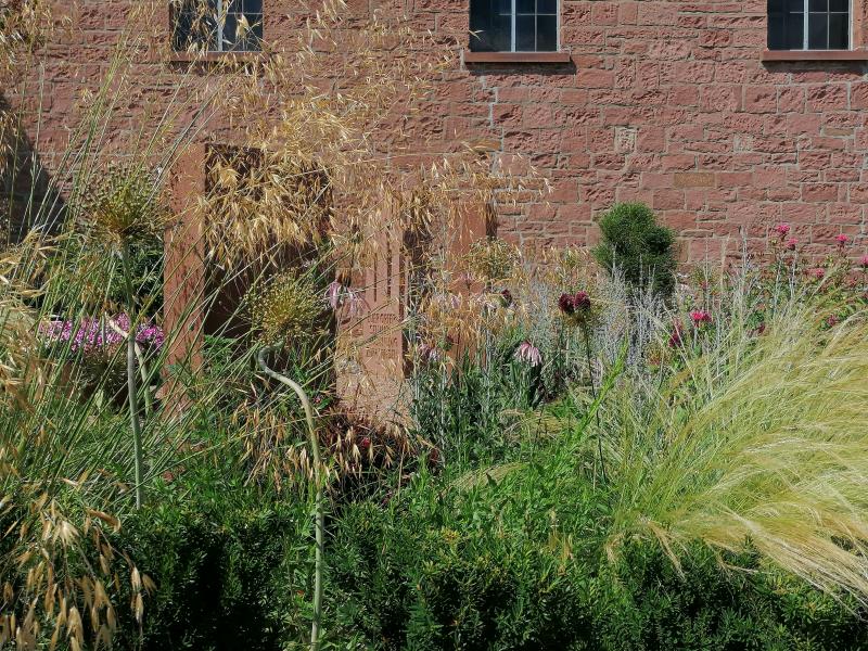 Stipa gigantea lässt sich einfach nicht gescheit fotografieren. Dazwischen kommt gerade Echinacea pallida. In wenigen Wochen dürfte dann alles voller Gaura und Perovskia sein