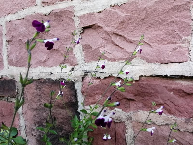 Direkt an der Kirchenmauer probiere eher schutzbedürftiges. Hier z.B. Salvia greggii "Amethyst Lips". Sie kommt schon 2 Jahre durch den Winter und blüht unermüdlich bis zum Frost. Auch eine kleine Feige ist gepflanzt.