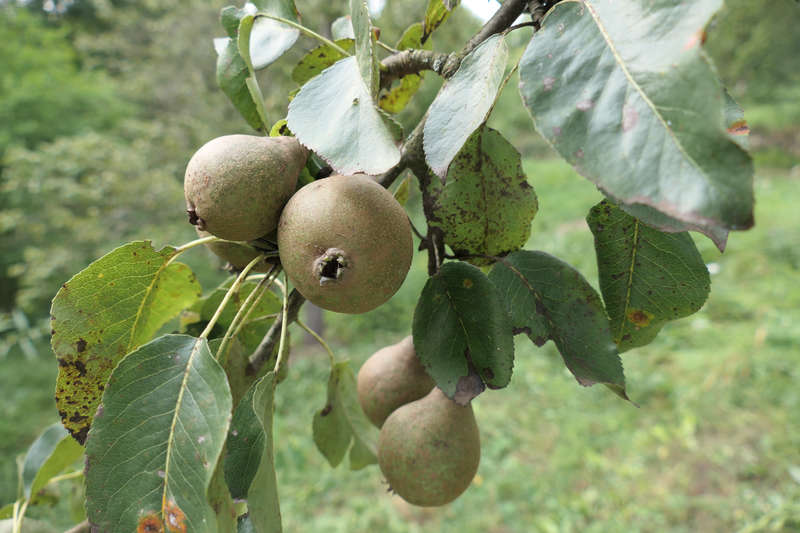 Genug gejammert. Es geht um eine Winterbirne, die teuer als Josefine von Mechelen verscheppert wurde. Ist sie aber nicht, die kenn ich. Die hier hat im Gegensatz zur Josefine keine Rostkappe, ganz andere Schalenstruktur und andere Merkmale stimmen auch nicht. Hier ein paar Früchte von gestern, sie wirken bis in den November hinein grün und unreif, meist stark berostet. Höchst selten bekommen sie einen Anflug von braunroter Farbe. Hat etwas Russtau. Die Birnen sind 6,5 bis 7,5cm dick und wenig höher. Jetzt süss, gerbstoffrei, hat 60° OE, Aroma nicht stark aber gut. Lagerfähig, wird noch besser, hat aber auch Steinzellen. Hängt jetzt Ende Oktober immer noch fest am Baum, so wars auch in wärmeren Jahren. Der Baum ist sehr gesund, keine Probleme. Das Schnittbild ist nicht sauber, eins der Kind hat mir heute morgen die Birne unzulässigerweise weggemampft.