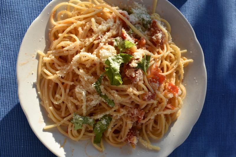 Spaghetti mit frischen Tomaten, Frühlingszwiebeln, ein Hauch Knoblauch, Olivenöl und Parmesan.