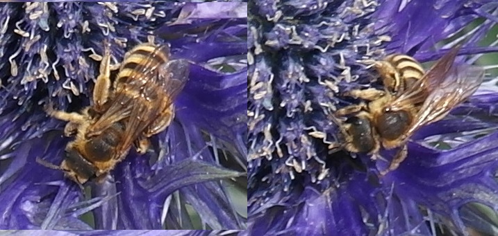 Die Streifen scheinen breiter zu sein als bei einer Honigbiene und die Beine sind stark behaart. Was könnte das für eine sein? Die Biene hat sich am Mannstreu gütlich getan.