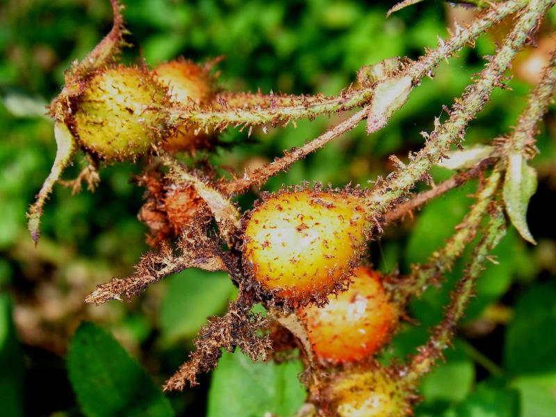 die Früchte halten meist nicht langRechts von Moyesii beginnt unser kleines Wäldchen. Seit 3 Jahren haben sich dort Rehe angesiedelt. Seither gibt es nur noch wenige Rosenblüten und diese erst ab einer Höhe von 150 cm. Der Anbau von Bohnen und sonstigem Gemüse ist nicht mehr möglich. Ein Elektrozaun soll Abhilfe schaffen.