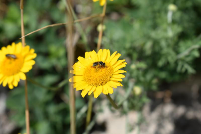 Zu meinem zweiten Bild: Bei Wikipedia steht, daß es auch ganz schwarze Exemplare der Knautien-Sandbiene gibt. Das würde mir dann sehr einleuchten, denn sie bewegt sich genauso, hat dieselben goldenen Fransen, hat dieselben Pollenhosen.