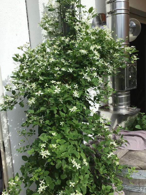 Neben unserer Terassentür wächst seit mehreren Jahren die Mandschurische Waldrebe, Clematis mandschurica, in einem großen Kübel. Die Blüte ist schön wenn auch nicht spektakulär. Der Duft ist einzigartig besonders in der Dämmerung. Schwer zu beschreiben ein Gemisch von Mandel mit Frucht.