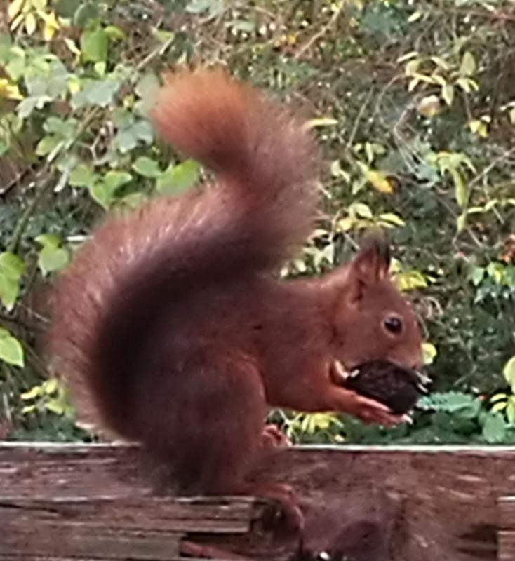 "Mein" Eichhörnchen hüpfte heute auch wieder im Garten herum, auf dem Weg zu Nachbars Walnussbaum. Im Frühjahr darf ich dann immer etliche Walnuss- und Haselnuss-Sämlinge jäten, weil die Nüsse überall versteckt sind...