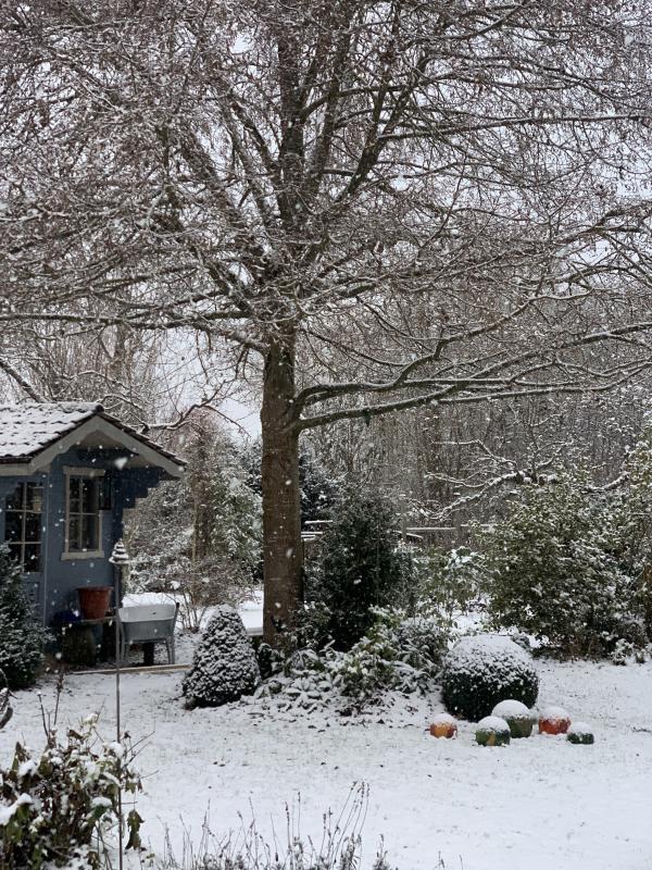 Es schneit, gar nicht mal ganz wenig, der Amberbaum hat noch allerlei Laub, hoffentlich übersteht er es.
