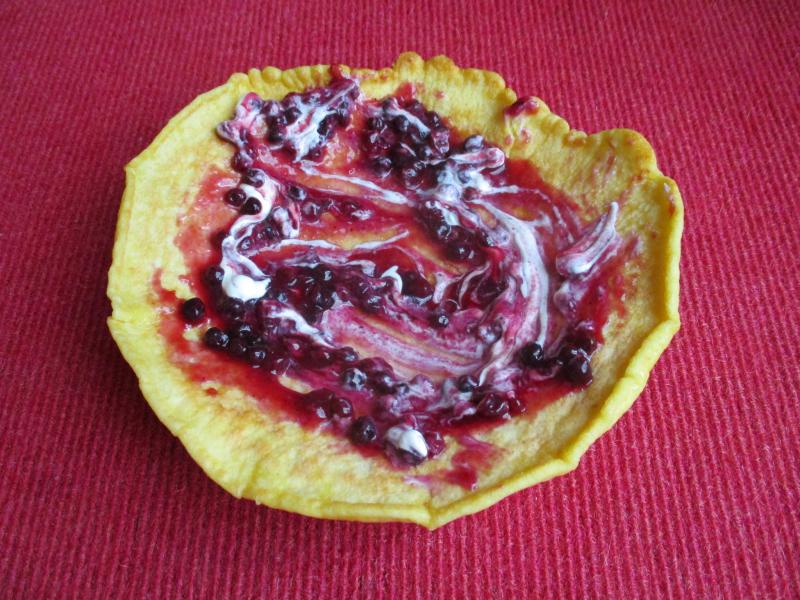 Hier Eierkuchen mit Heidel- und Preiselbeeren und Crème fraîche (ein Teller ist drunter, sieht man nur nicht).