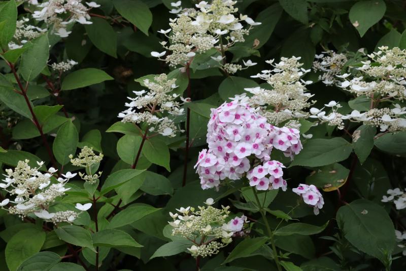 Dass Phloxe Halbschatten mögen, kann man hier in der zufälligen Kombination mit Deinanthe sehen.