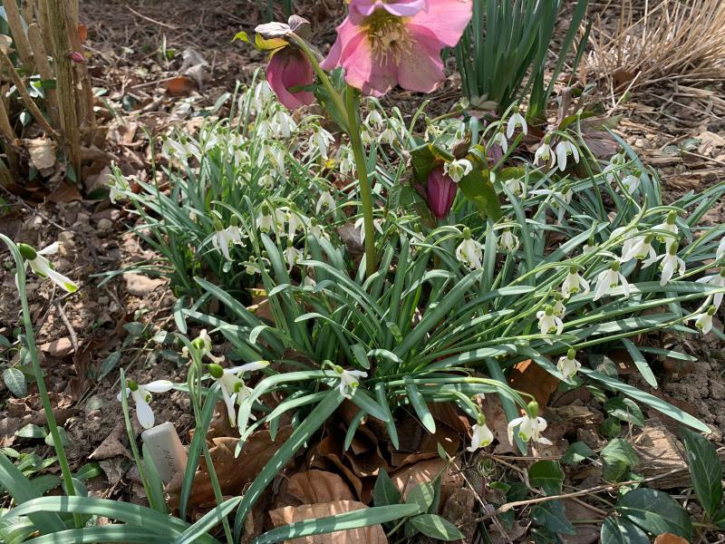 hier entwickelt sich der Garten auch nur ganz allmählich etwas vorwärts. Dank der gleichbleibend kühlen Tagestemparaturen und immer mal wieder leichten Nachtfrösten, verwelken die Frühblüher nur ganz allmählich. Nur den Krokussen behagt dieses sonnenarme Grau nicht so recht. Die Helleboren blühen ausgiebig. Hier sieht man links im Bild eine für mich Namenlose, die schon vom Vorbesitzer gepflanzt wurde. Im Hintergrund die dunkle heißt Merlot. Ansonsten viele Gehölze und wirklich überall Schneeglöckchen.