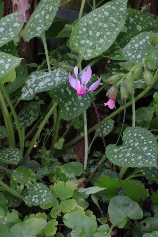 Zwei Überraschungen heute: unter dem Kiwispalier am Gemüsegarten blüht ein Alpenveilchen.