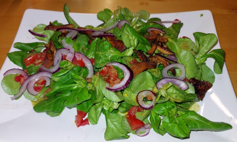 Heute gab's Feldsalat mit Tomaten, roten Zwiebeln und ein paar Edelreizkern.