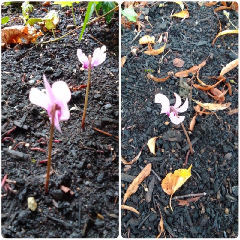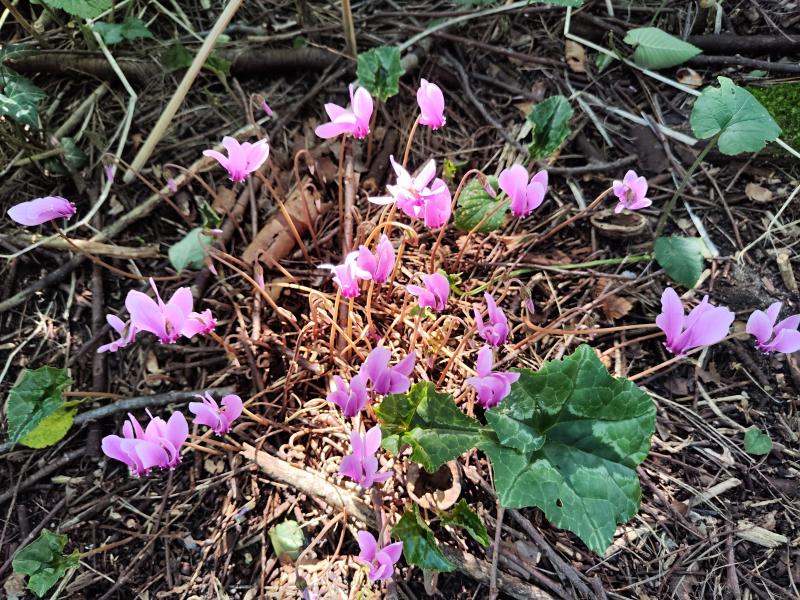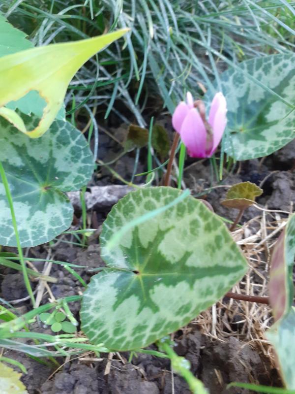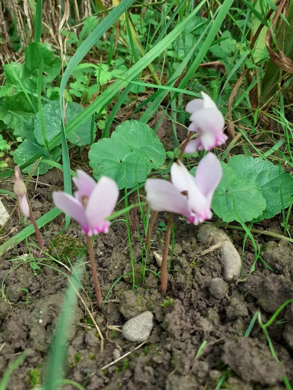 Während ich im „Salon“, im Hauptgarten, versuche, sowohl passende als auch gut sichtbare Pflanzplätze für Cyclamen purpurascens zu finden, entwickelt sich im „Vorzimmer“, im Vorgarten, klammheimlich eine purpurascens-Wiese - ich hab heute 9 blühende Sämlinge der Pflanze gefunden, die ich schon um 1995 herum gepflanzt hatte….