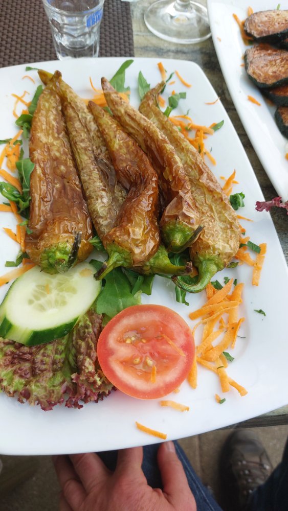 Gebratene Spitzpaprika, Zucchini mit Tzatziki und Bauernsalat beim Griechen