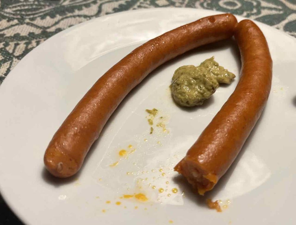 Heute Abend ganz simpel: Debreziner gesotten und mit Basilikumsenf sowie Kartoffelpüree mit Schnittlauch zum Tyskie-Bier aus Polen