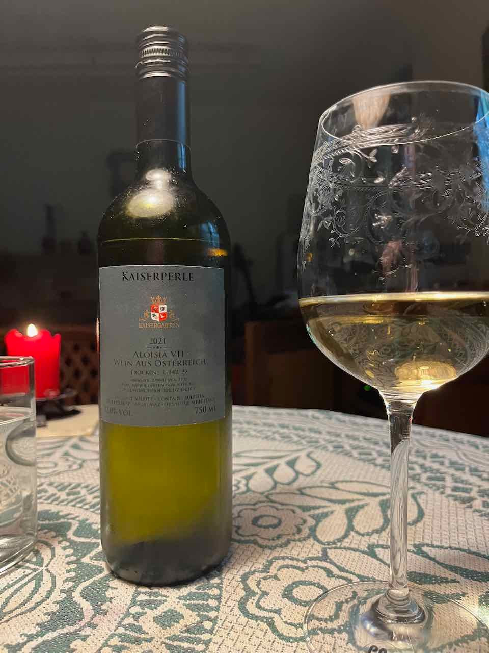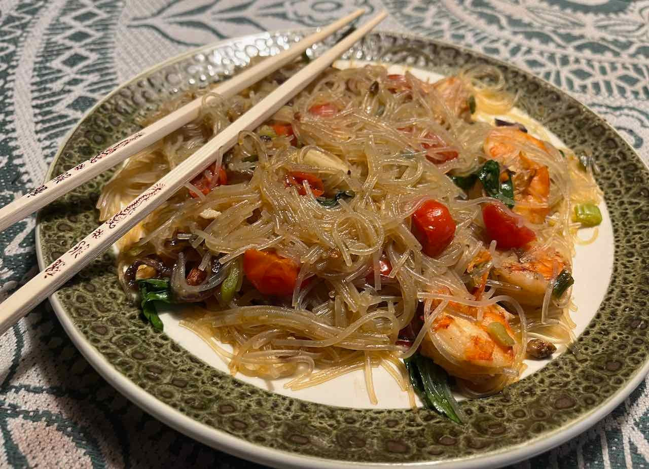 Dünne Glasnudeln mit Black-Tiger-Garnelen, Kirschtomaten, roten Zwiebelringen, Knoblauch, Ingwer, Zitronenabrieb in Olivenöl und etwas Gemüsebrühe gebraten zur "Aloisia VII" 2023 aus dem Burgenland