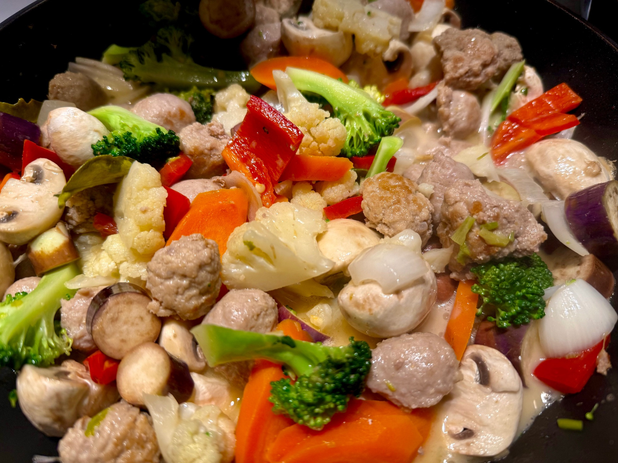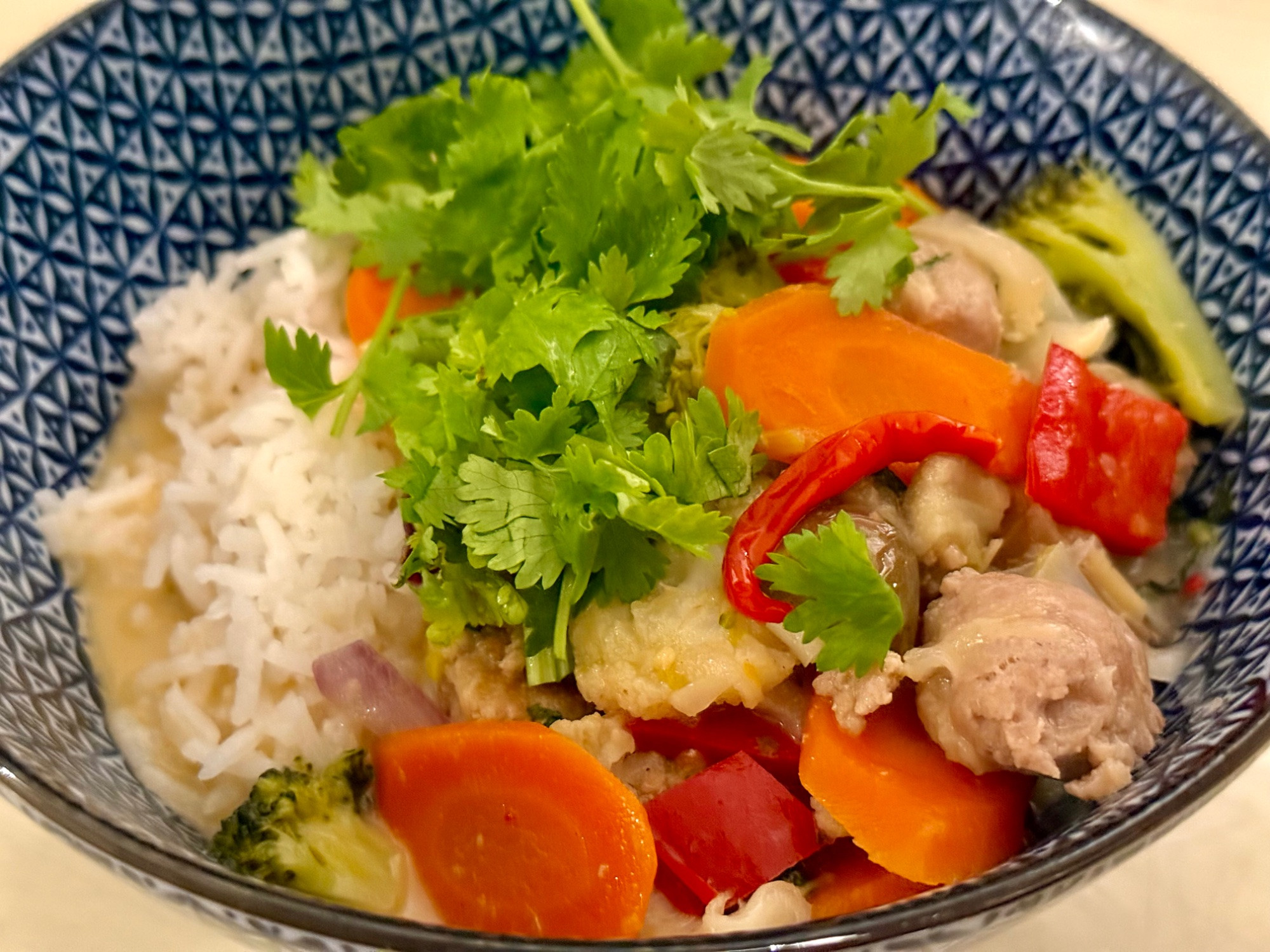 hier mal wieder thailändisch inspiriertes allameng: schweinefleisch (rohes wurstbrät und hack), gemüse und kräuter mit grünem curry und kokosmilch