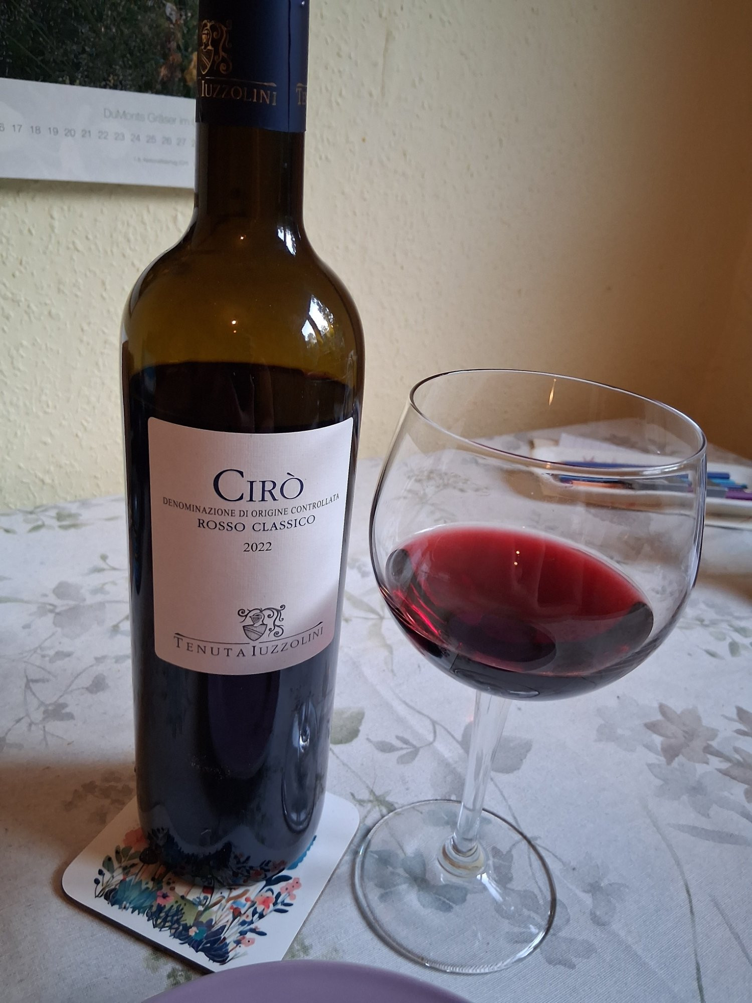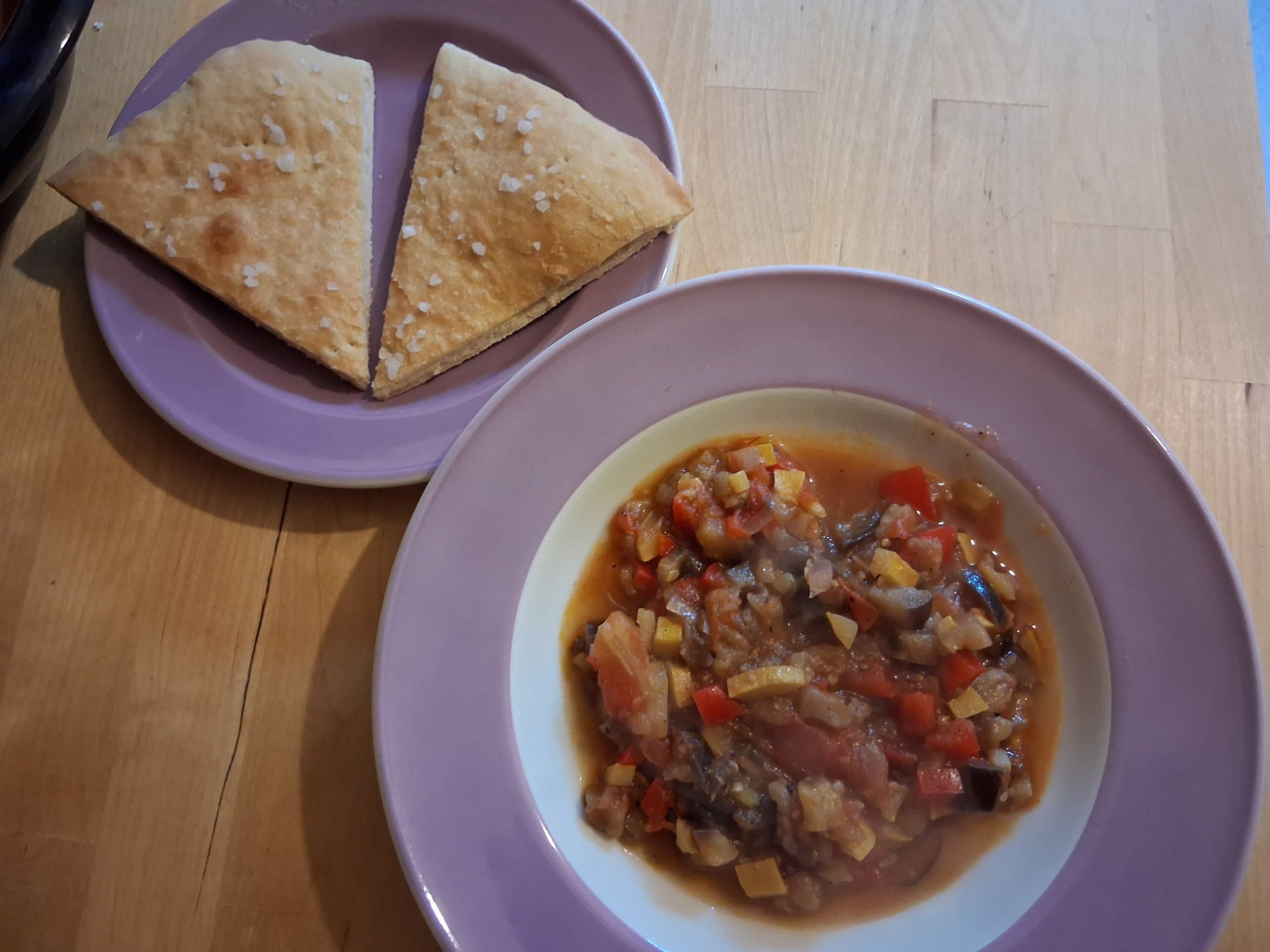 Ratatouille und selbstgemachtes Pizzabrot, dazu Lammwürstchen und einen Ciro rosso.