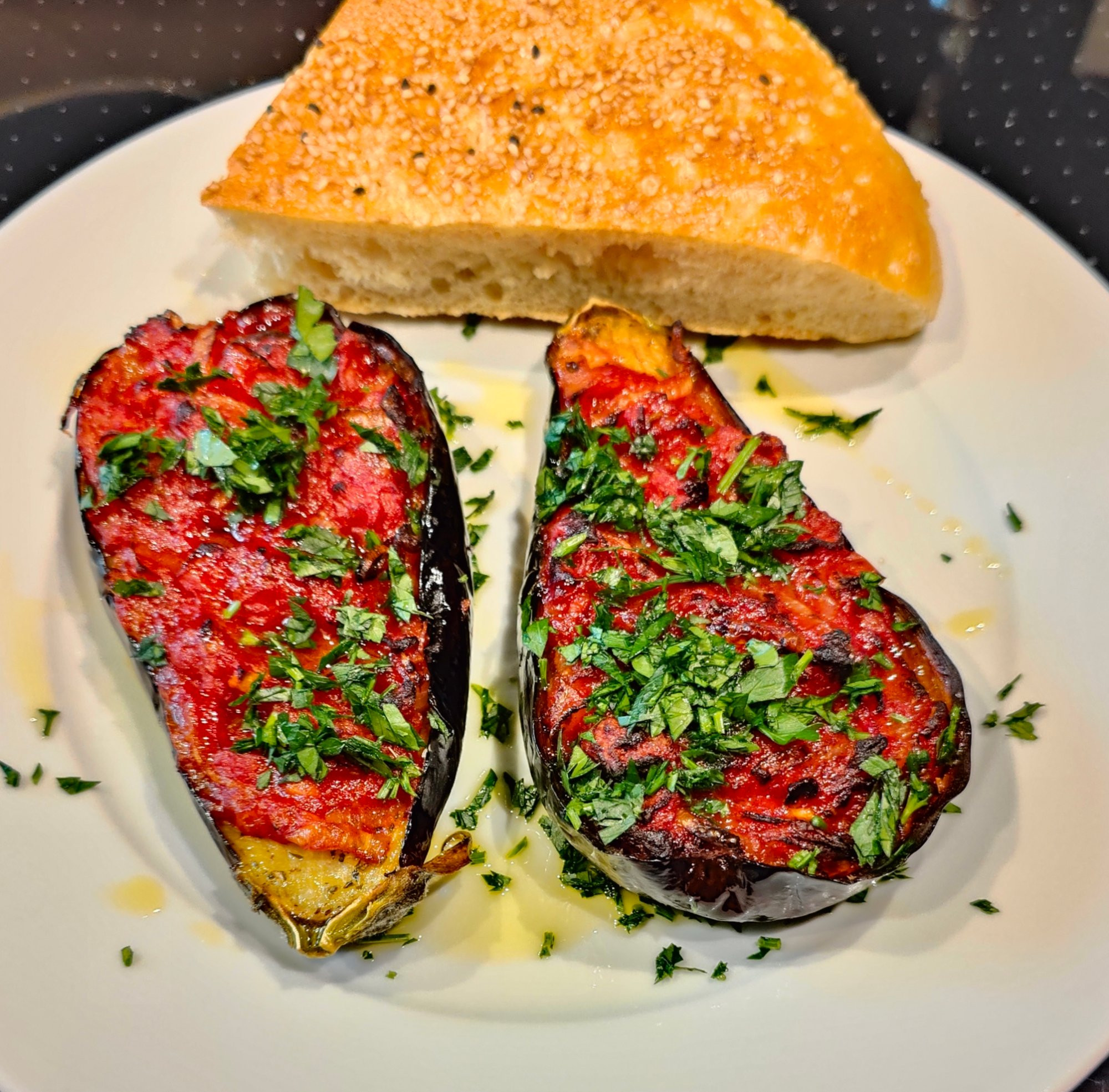 Schnelle Imam Bayildi aus dem Airfryer, dazu Fladenbrot