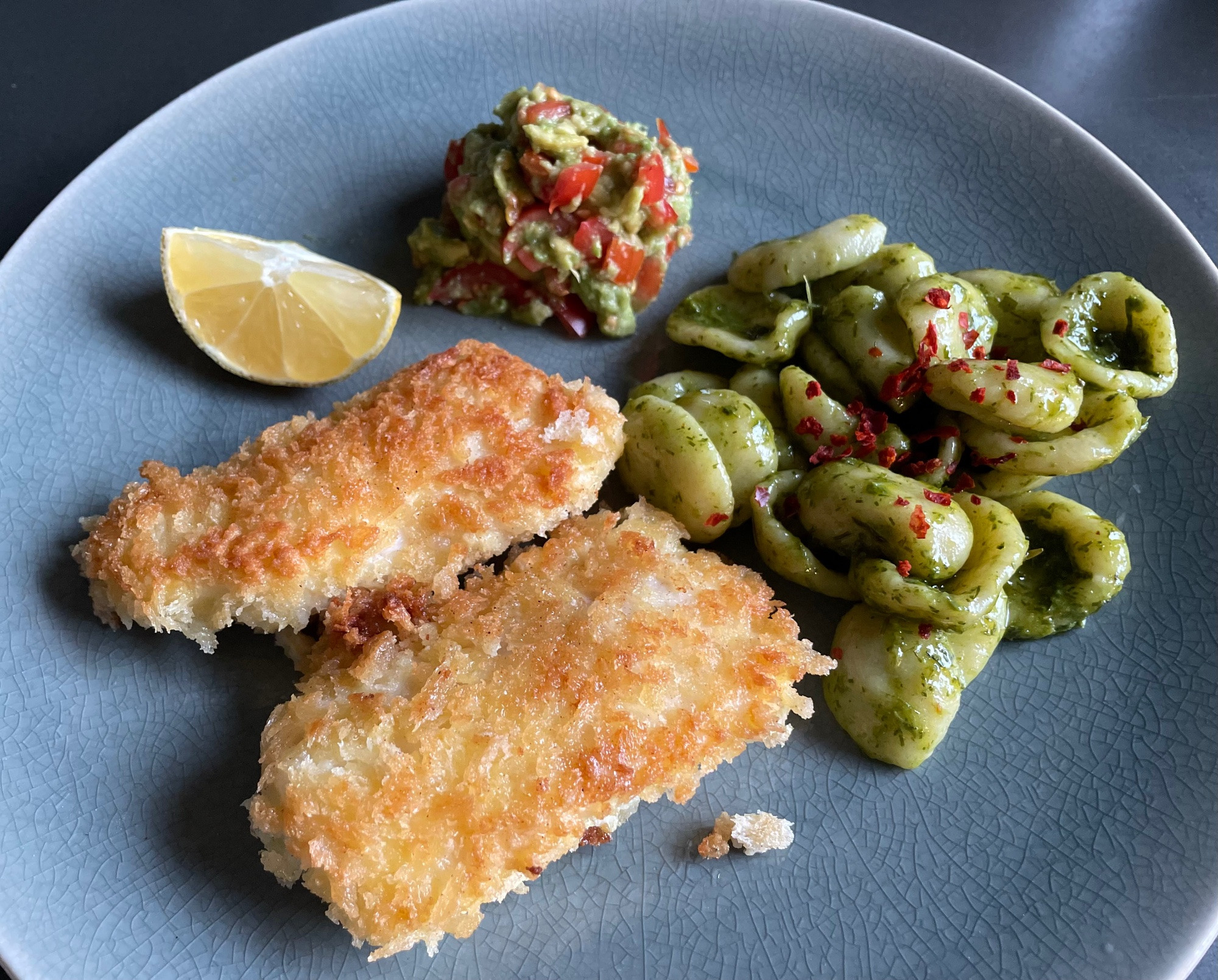 Bei uns gab es heute Steinbeißerfilet in Pankomantel, Orechiette mit Estragon und Avocado mit Tomate.