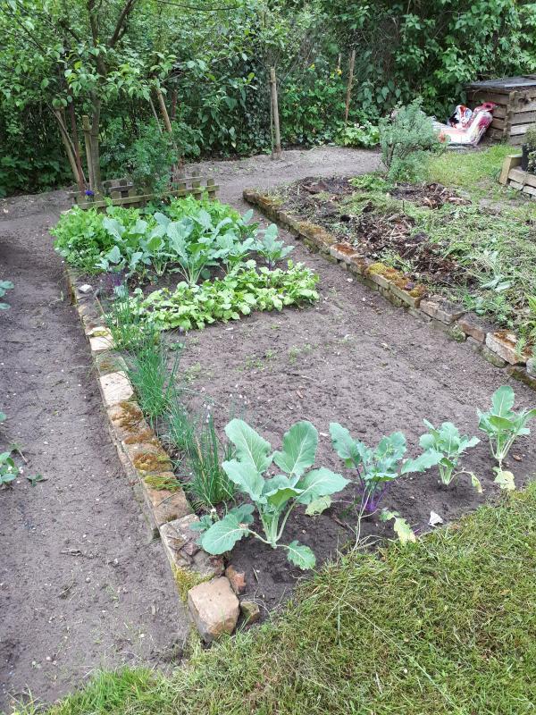 Hier stehen ein Block Erbsen, paar Kohlrabis, ne fertige Reihe Radieschen und Mickermöhren. In die freie Fläche vorn habe ich gestern noch Rote Beete eingesetzt. Die vorgezogenen Pflanzen war sehr klein, aber besser als ins Beet immer noch... gleich schön auf Abstand. In das Beet mit dem ewigen Kohl habe ich auch gestern noch meine Grünkohlpflänzchen gesetzt. Gleichfalls recht klein, es war zeitweilig ganz schön kalt im Anzuchtzelt. Aber es ist ja noch so früh im Jahr, der hat so viel Zeit....