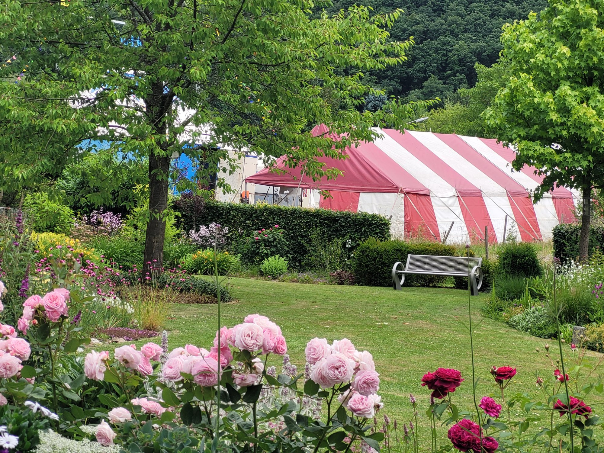 Aber ist Euch aufgefallen, daß sich auf der hinteren Wiese gerade ein rotweißes Zirkuszelt breit macht