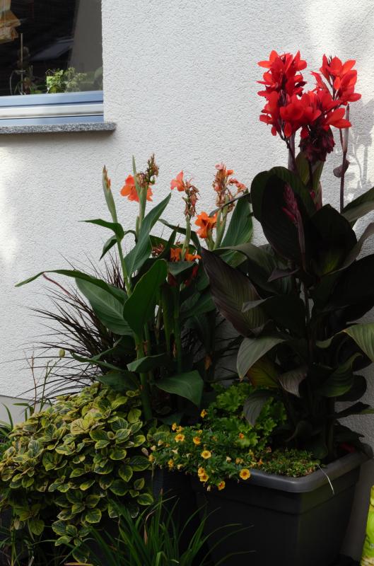 An der Nordseite des Hauses stehen vor dem Geländer der Kellertreppe die vielen Hosta-Töpfe. Und darüber liefern Pflanzkästen etwas kräftigere Farben!
