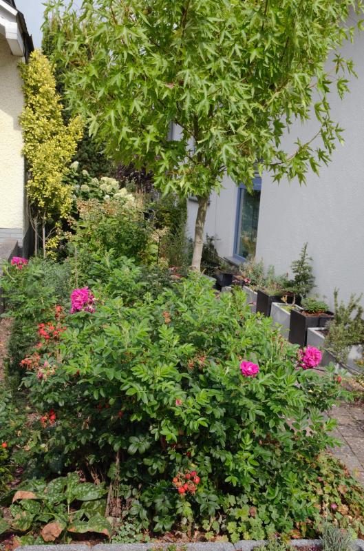 Rose 'Moje Hammarberg' hat mit der Trockenheit keine Probleme, auch der Amberbaum hält gut durch.