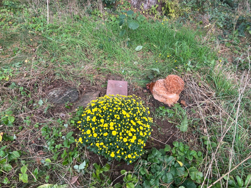 Hühner haben bestimmt ein recht gutes Erinnerungsvermögen. Wenn sie bei Jussis Beerdigung dabei war, ist es schon möglich, dass sie dahin geht, weil sie ihn da das letztemal sah. Ob sie wirklich den Tod begriffen hat, das weiß ich natürlich nicht, aber ich glaube schon, dass Hühner durchaus sehr trauern können, sie werden ja oft in Vielem unterschätzt.
