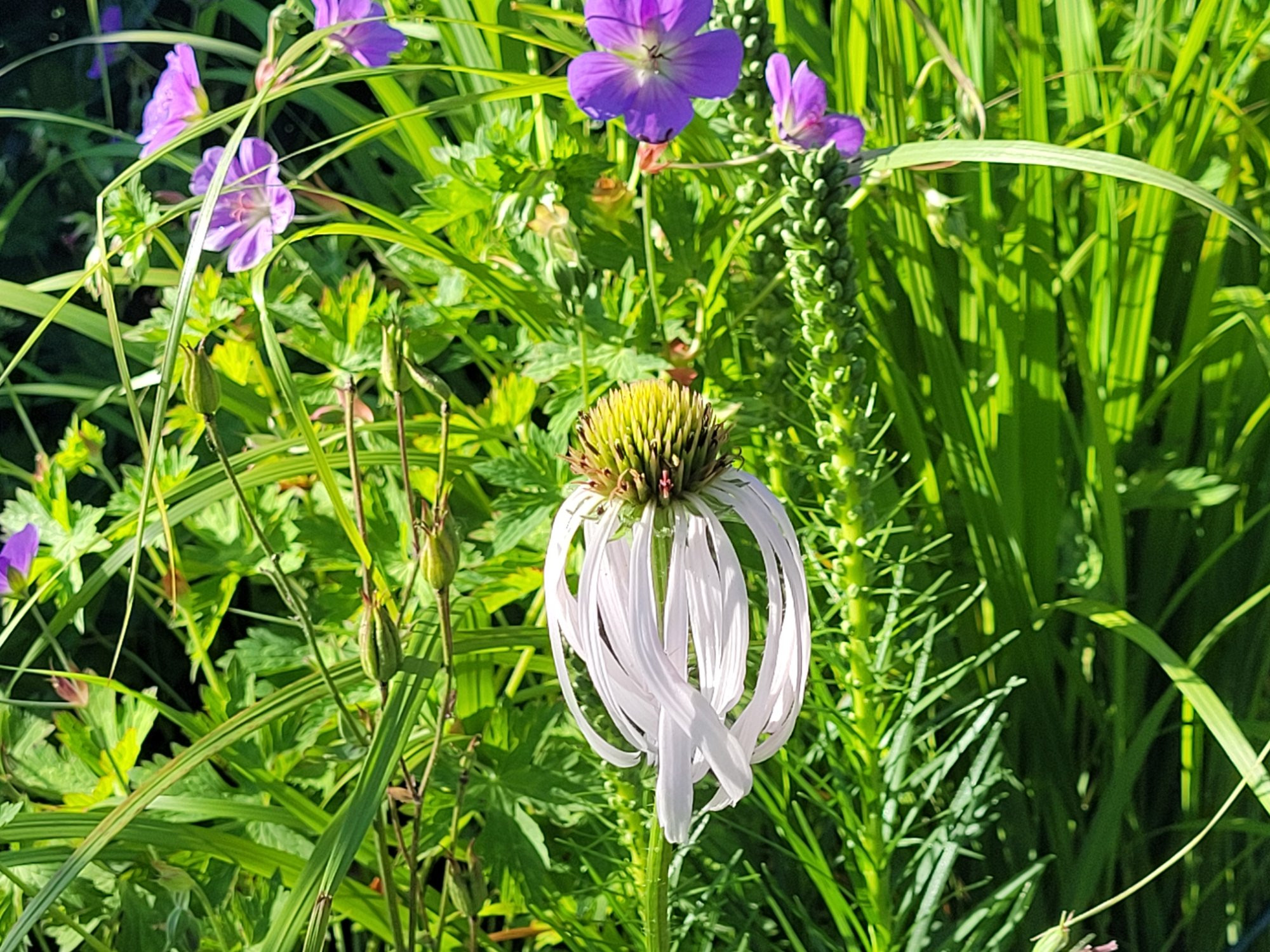 Oder auch Echinacea pallida... die mit den hängenden Blütenblättern. Oder den gelben paradoxa, wenn es bei Dir farblich passt.