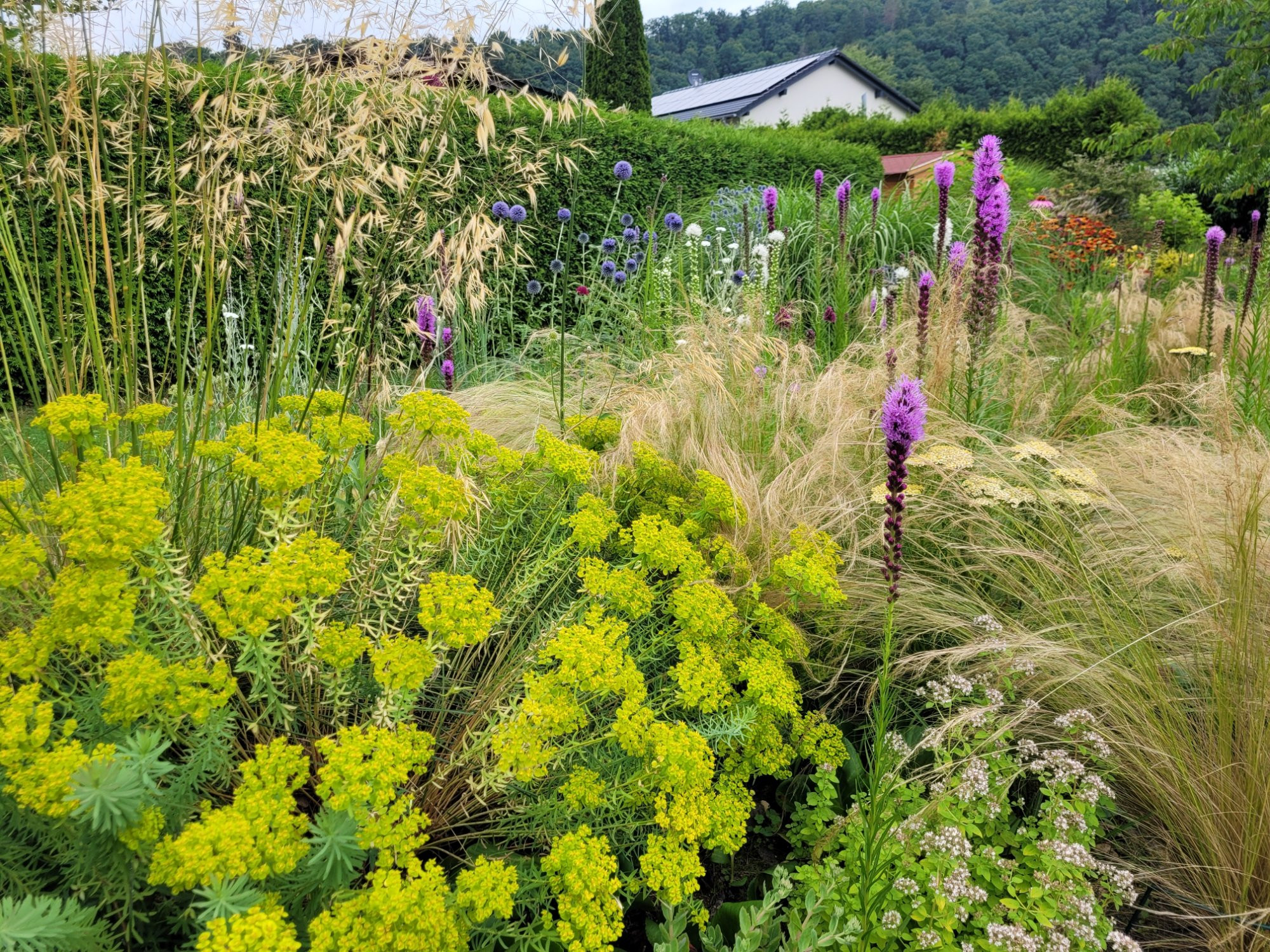 Hier im Steppenbeet trumpft nun Liatris spicata so richtig auf. Der schöne Regen hat ihr offensichtlich gut getan.
