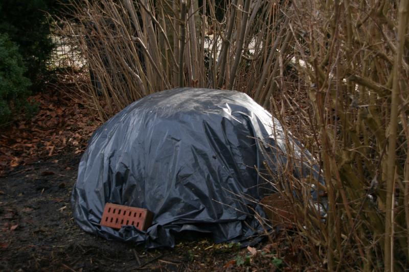 mein diesjähriger Terra-Preta-Haufen. Im Frühling mit gehäkselten Sträucherschnitt, Pferdemist, Em-aktiv, Urgesteinsmehl, Holzkohle aufgesetzter Haufen. Dem lasse ich jetzt noch bis Juli die Folie, dann kommt die runter und wird mit Mulchmaterial abgedeckt und liegt dann ein 1 - 1 1/2 Jahre bis er verwendbar ist.