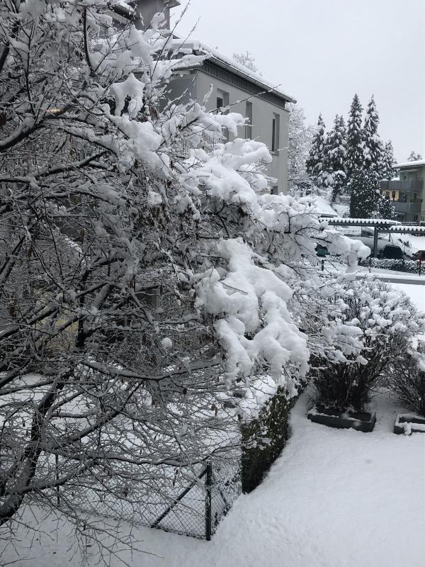 Bei uns hat es 2 Tage geschneit, der Blick aus dem Fenster des Arbeitszimmers und von der Terrassentür nebenan.