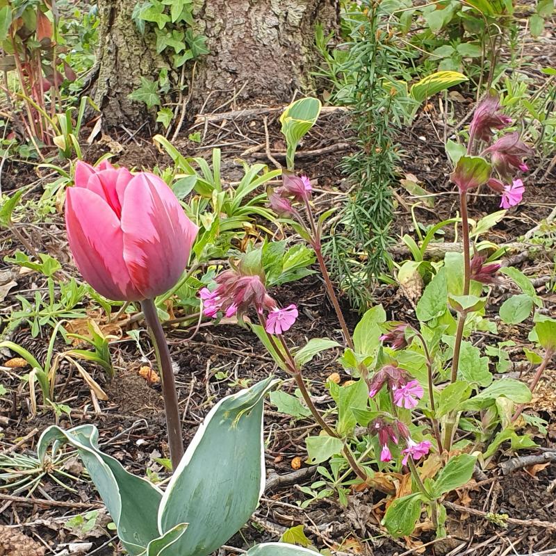Eine ganz hübsche Zufallskombi, wie ich finde. Silene dioica und Tulpe Pretty Prinzess. Vielleicht wird das nächstes Jahr noch ein wenig üppiger