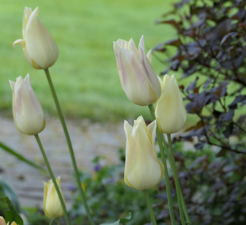 Ich kenne 'Elegant Lady' so, dass sie erst einmal "käsegelb" aufblüht, dann langsam diesen Elfenbeinton annimmt, und nach und nach kommt auch der violette Schimmer hinzu. Das dauert meist drei, vier Tage, und gerade am Anfang sieht dieses Gelb nicht so hübsch aus. Sie war aber auch hier immer die letzte Tulpe, die ihre Blüten öffnet (dieses Jahr habe ich keine, hoffentlich haben wenigstens ein paar Tochterzwiebeln überlebt).