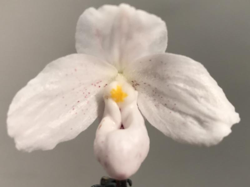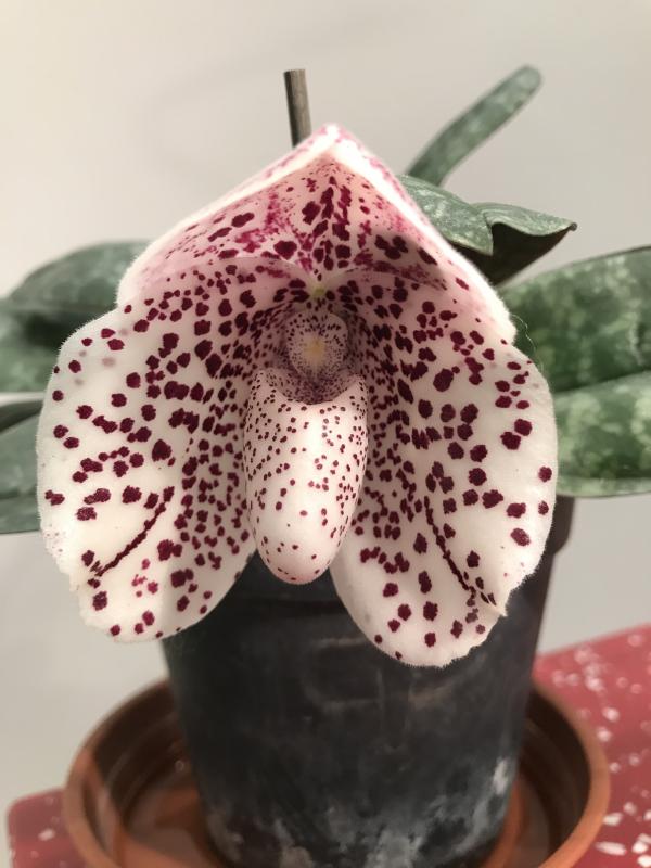 Einen Schuh mit Tupfen kann ich gerade auch zeigen. P. x wenshanense hat P. bellatulum als einen Elternteil, der andere (P. concolor) hat hier mehr zur Optik beigetragen.