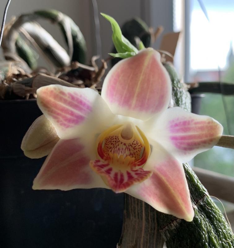 Ich schätze, das muss eine Art sein, papilio oder kramerianum, sie ist wesentlich zickiger (absterbende Neutriebe, keine Blütentriebe an ausgewachsenen Neutrieben) als die des Freundes, von der ich annehme, dass es x Kalihi sein muss und von der ich nun die Teilstücke bekommen habe.