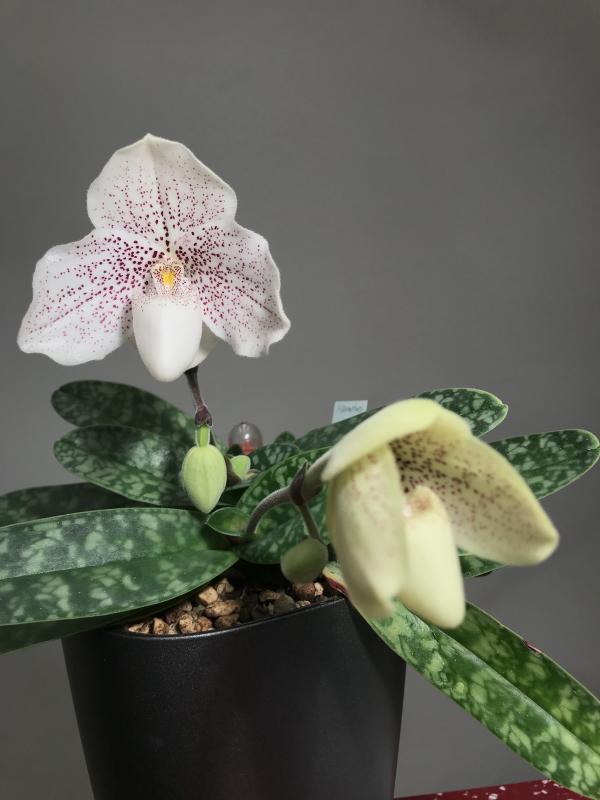 Die zweite ist vermutlich eine Hybride aus Paphiopedilum concolor und Paphiopedilum leucochilum, sie bildet pro Blütenstiel immer zwei Blüten.