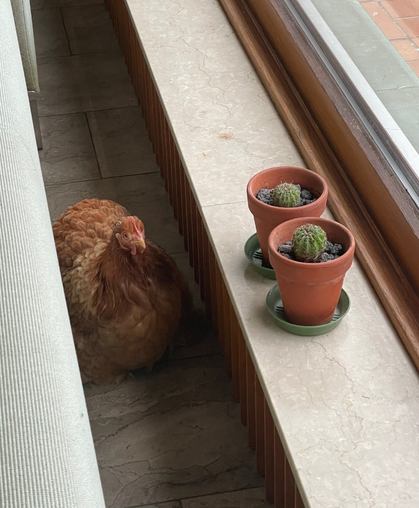 Bei dem Wetter hat sie zur Zeit keine Lust raus zu gehen. Das wird ihr natürlich angeboten. So verrückt es ist, wir haben uns richtig daran gewöhnt ein Huhn im Haus zu haben.