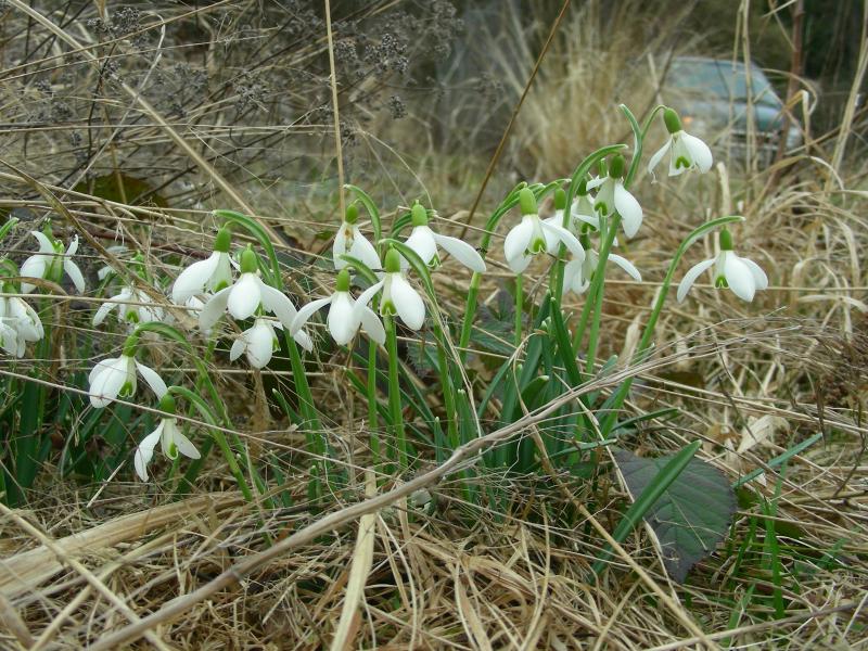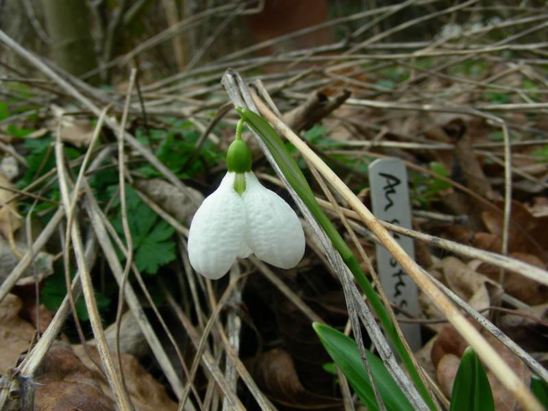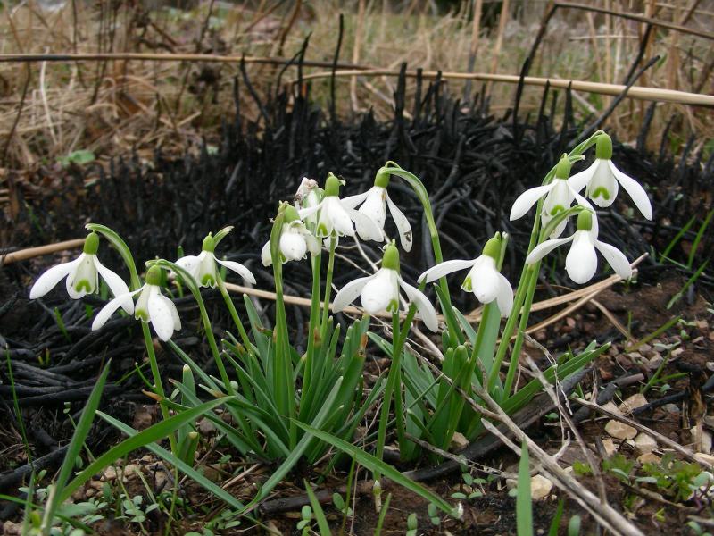 Galanthus nivalis ist offenbar nicht sehr empfindlich und hat das Abfackeln des Miscanthus im Januar überlebt. Die oben gezeigten Galanthus elwesii var. porreefolium sind offenbar auch tolerant.