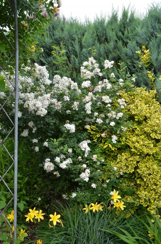 Hier ist eines vom Juni diesen Jahres, mit Rosa multiflora nana.