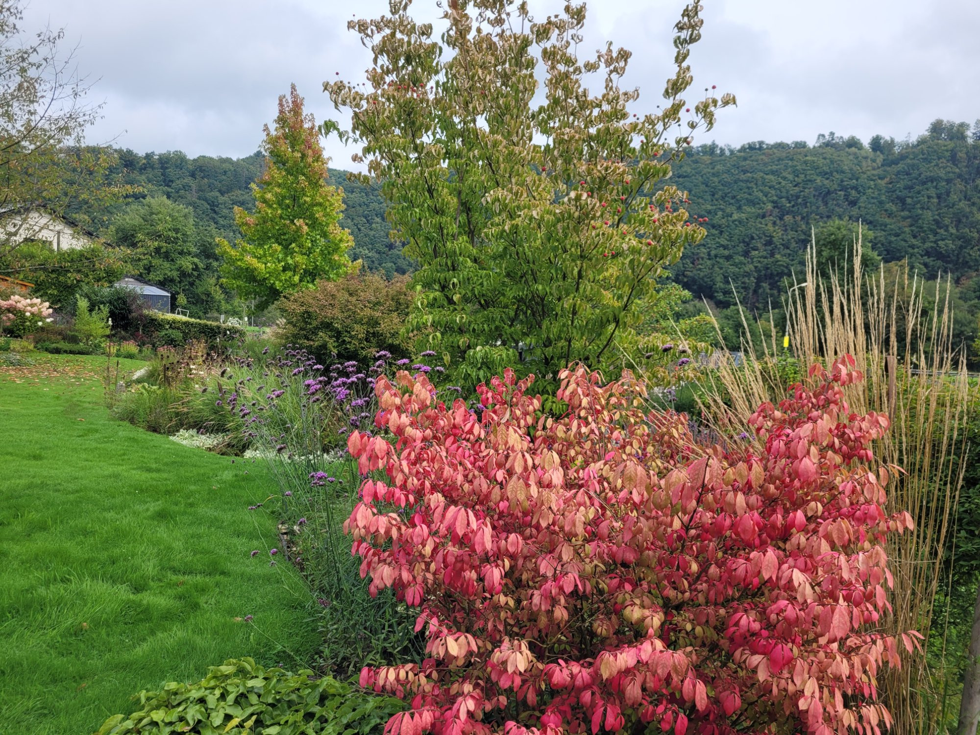 Beginnen möchte ich heute mit Startblick von der Terrasse aus ins Cornusbeet, wo Euonymus alatus 'Compactus' meinen Blick mit früher Herbstfärbung fesselt.