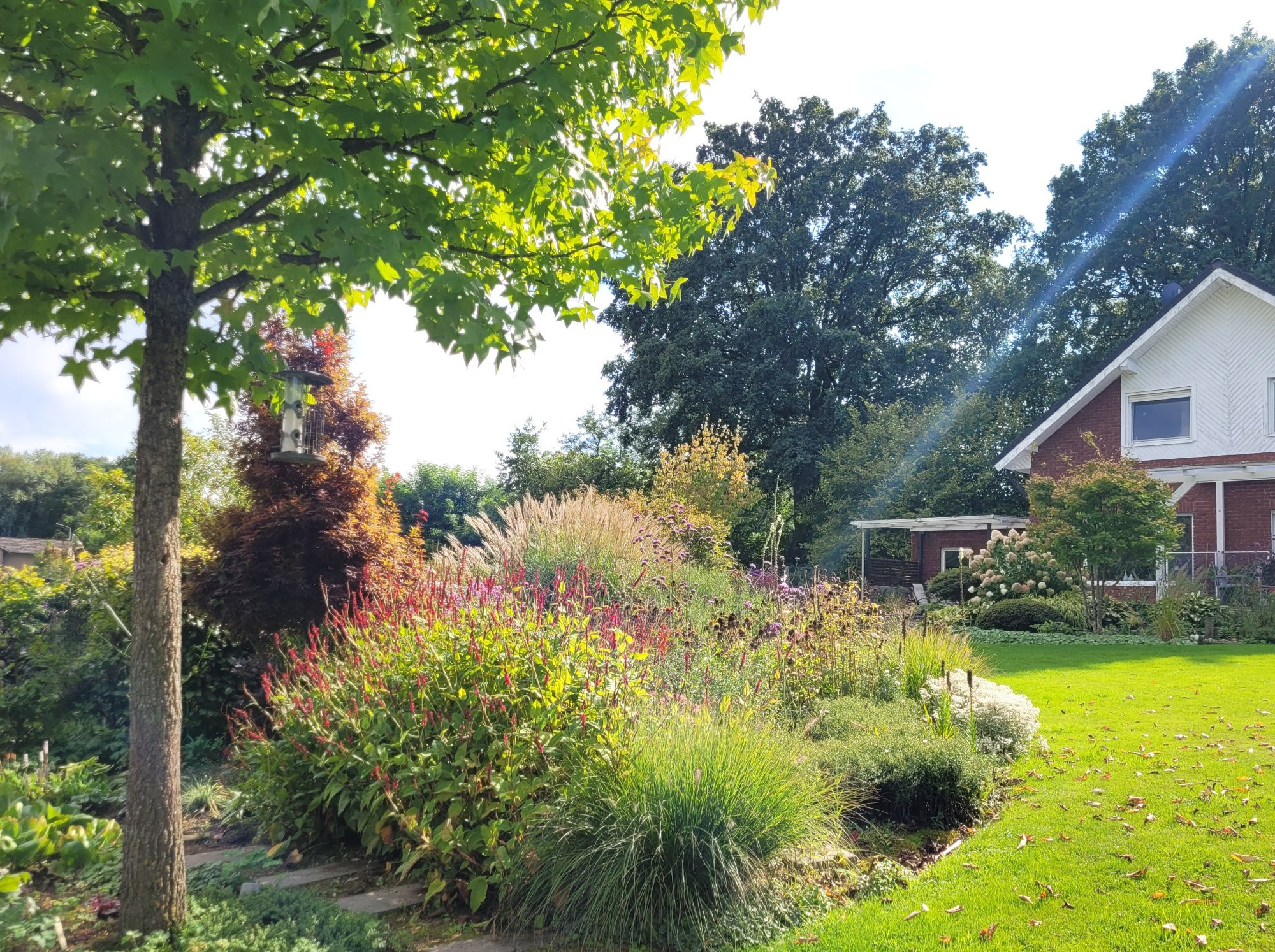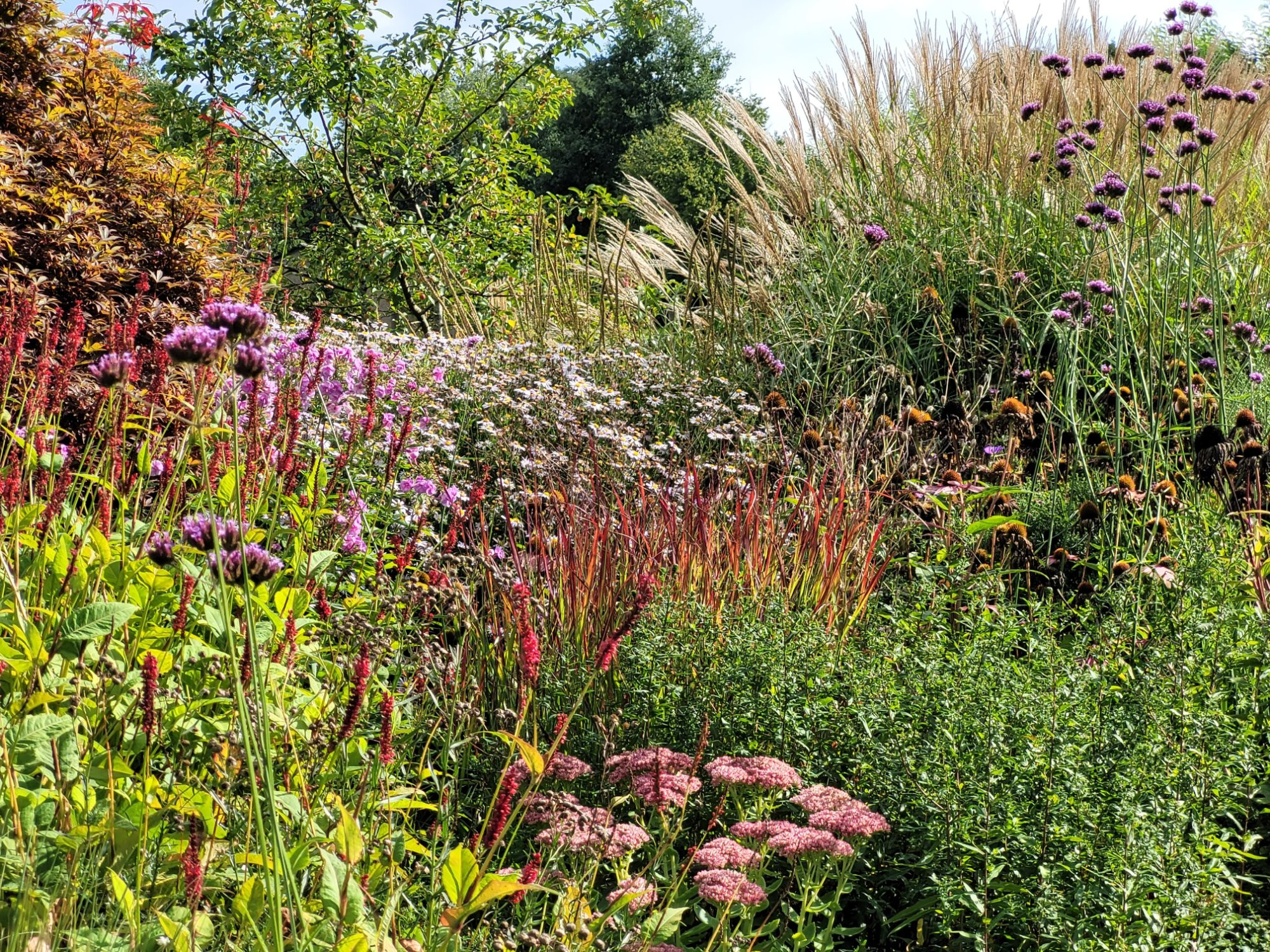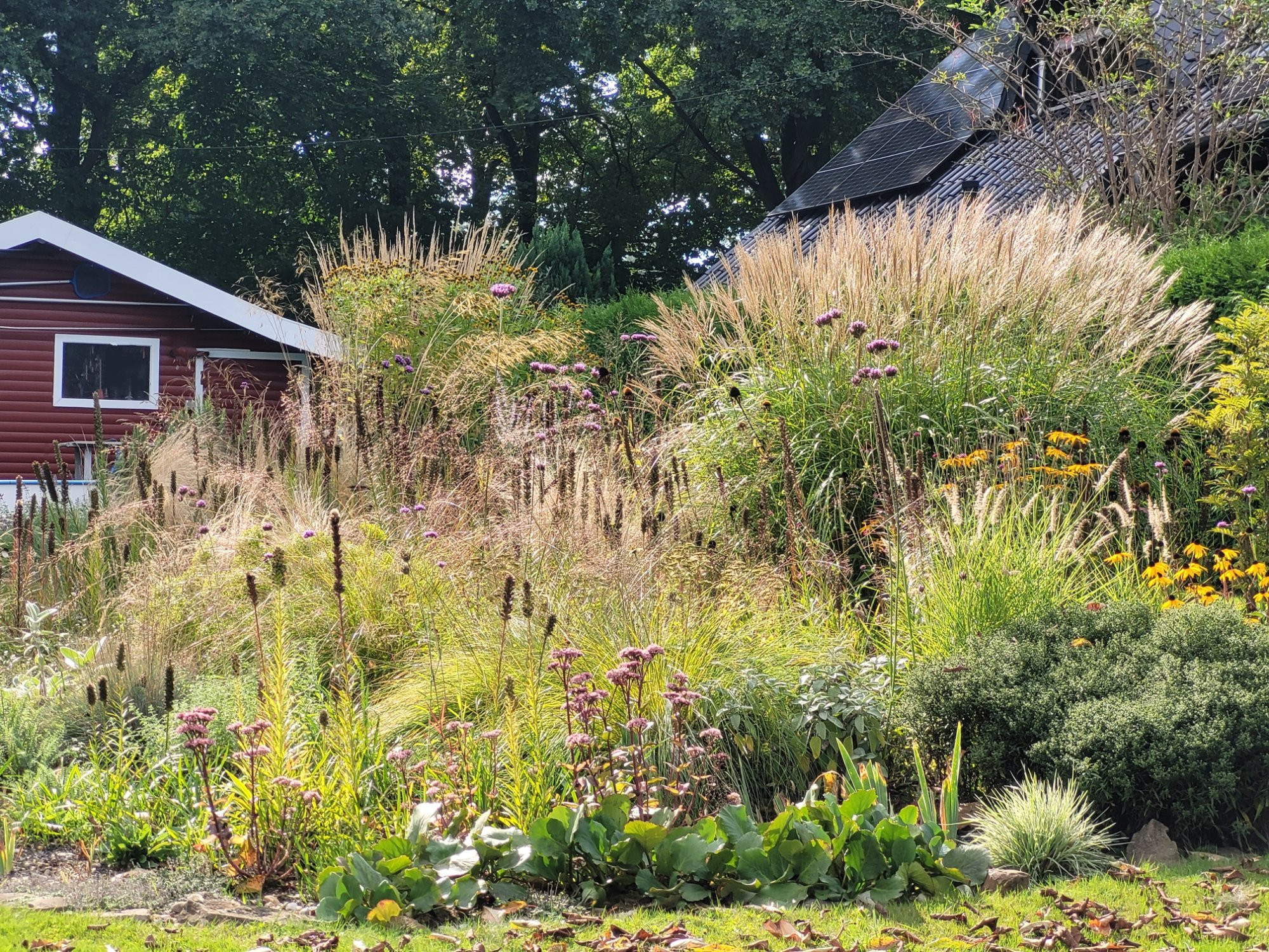 Lediglich die Astern lassen noch etwas auf sich warten... mittig davon leuchtet Panicum 'Shenandoah'.
