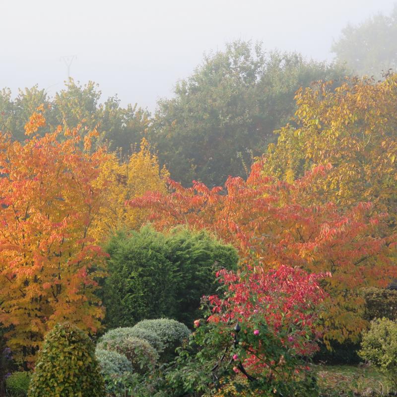 Hier ist nun das Herbstlaub in voller Pracht. Morgens war es noch neblig (Foto), jetzt ist der Himmel strahlend blau und die Sonne bringt alles zum leuchten.