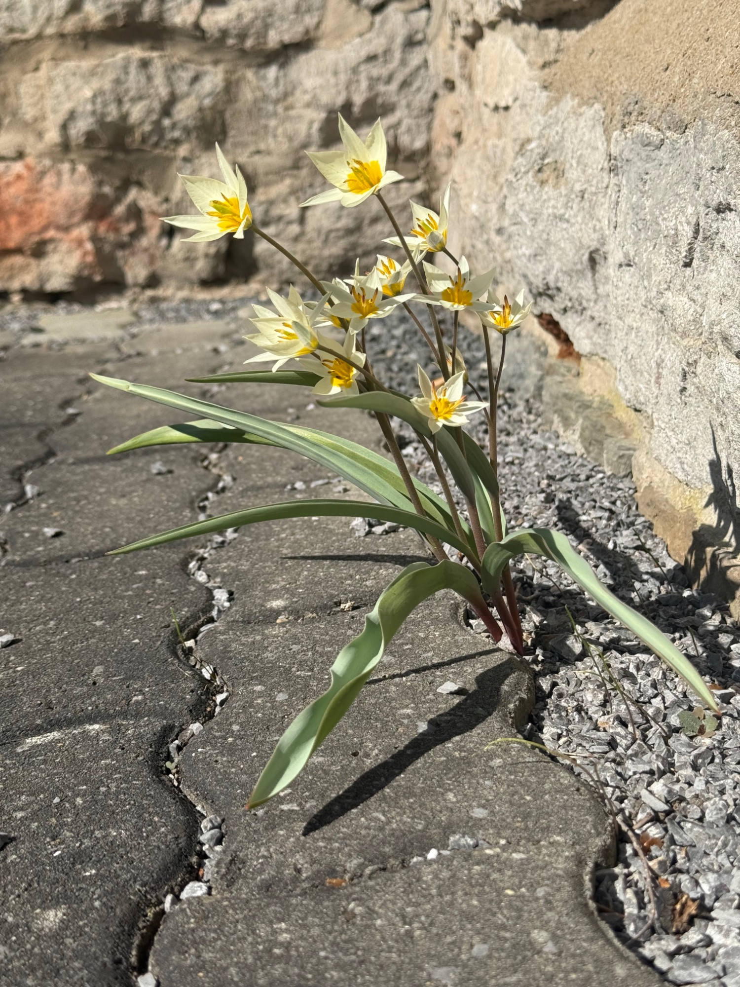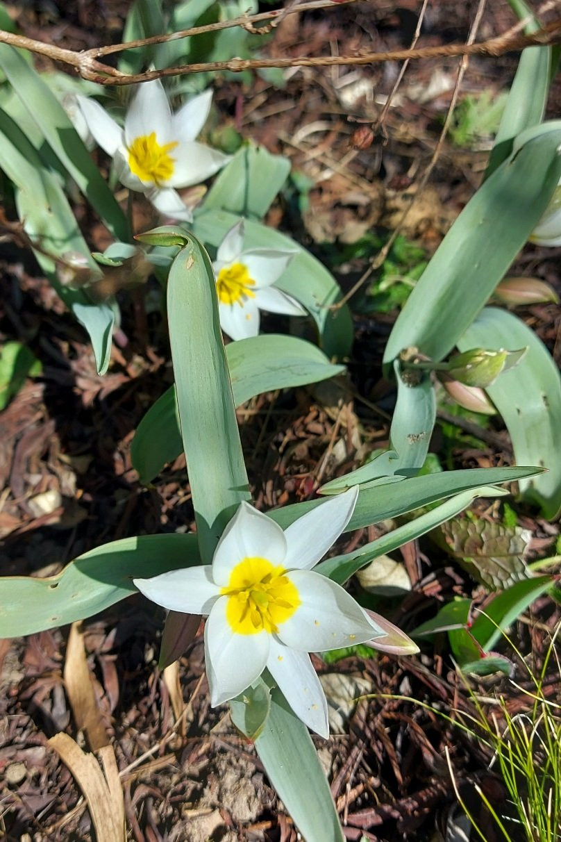 Die erste Tulpenblüte 2025 - heute hat hier Tulipa polychroma im Schotterbeet nach einer sehr frostigen Nacht ihre Blüten geöffnet.