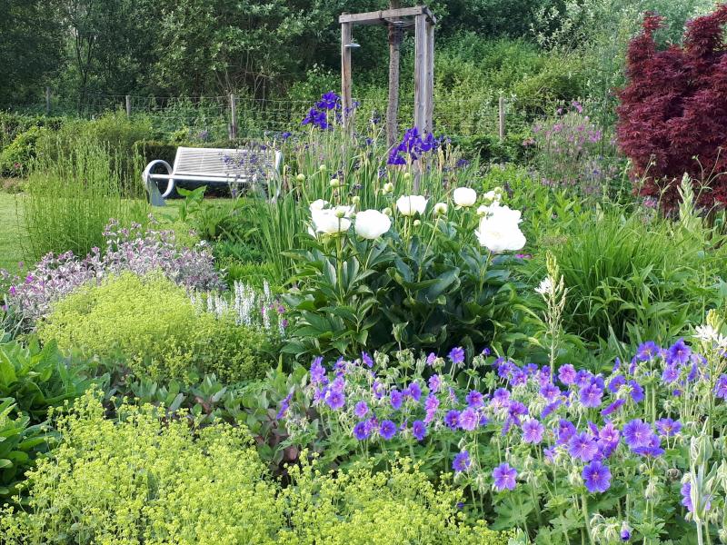 Meine Lieblings Pfingstrose 'Jan van Leeuwen'... mit ganz viel drumherum, übrigens auch Wieseniris wie bei Helga! :D