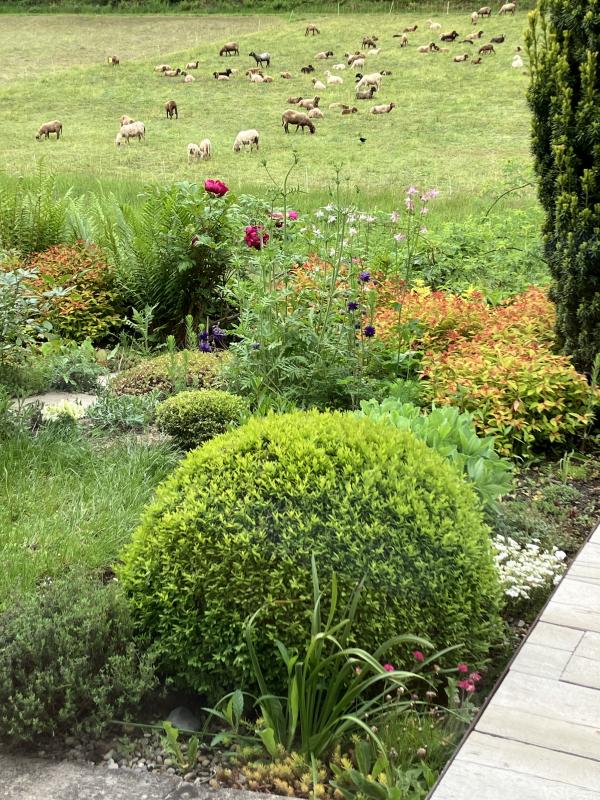 Kein fliegender Fisch, es blöckt das Schaf. ;) (Ausserhalb des Gartens, Blick aus dem Wohnzimmer.) (Das Wiesenstück wird jetzt seit ca. 4, 5 Jahren von den Schafen beweidet. Vorher wurde die Wiese 2x im Jahr gemäht. Leider haben die Blüten in der Wiese abgenommen, wobei sie diesbezüglich nie besonders vielfältig war. Geht wohl nicht zusammen, Wiesenidyll und Schafidyll.)