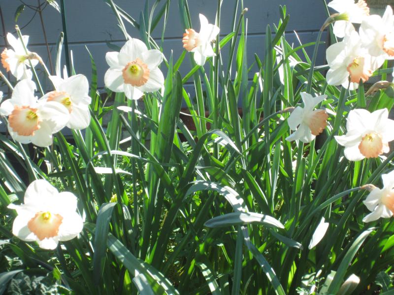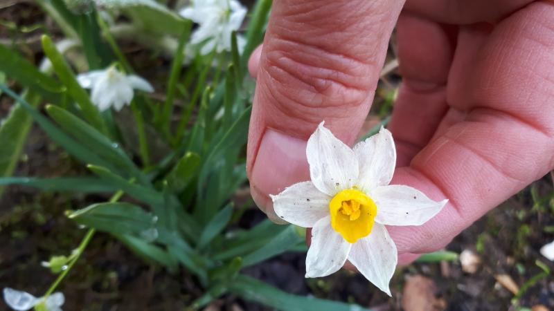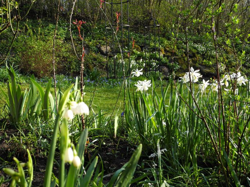 N. 'Thalia' stehen hier im "Innenhof" mit dem Steinwall voller Buschwindröschen