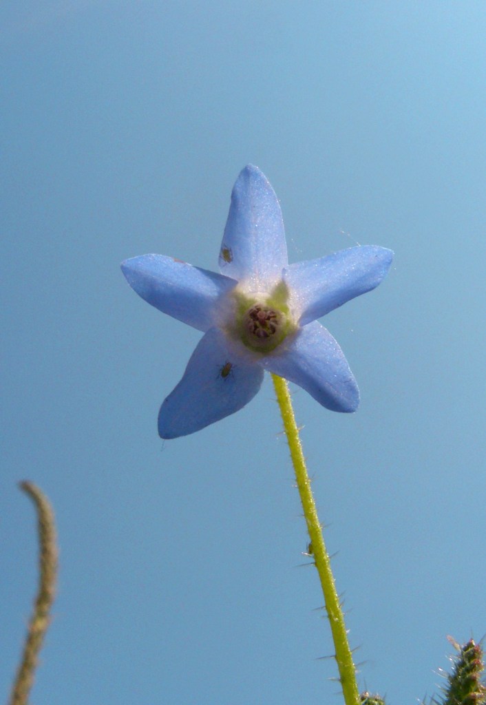 Borago pygmaea ist bestimmt keine klassische Steingartenpflanze, aber auf dem trockenen Kräuterbeet wollte sie auch nicht gedeihen. Da ich auf ihre hübschen himmelblauen Blüten nicht verzichten wollte, markiert der Zwergborretsch nun einfach einen feuchteren Bereich am Steingartenrande.