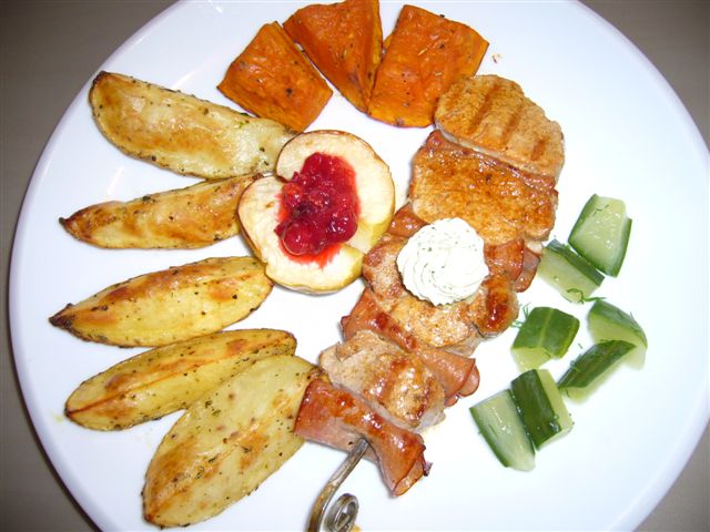Heute gab es:gemischtes Fleisch-Spiessli dazu Kartoffeln, Kürbis und Apfel aus dem Ofen und im eigenen Saft gedämpfte Gurke