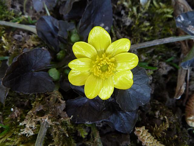 ein spontaner Sämling von Ranunculus ficaria mit hellgelber Vorderseite und blaugrauer Rückseite. Ich habe alle möglichen Sorten im Garten. Gehabt und noch. Aber freiwillige sind immer willkommen!